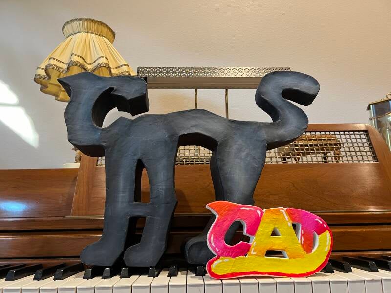 The piece features the artist’s cat, Poe Poe, the signature cowboy hat, and a Texas sunset.